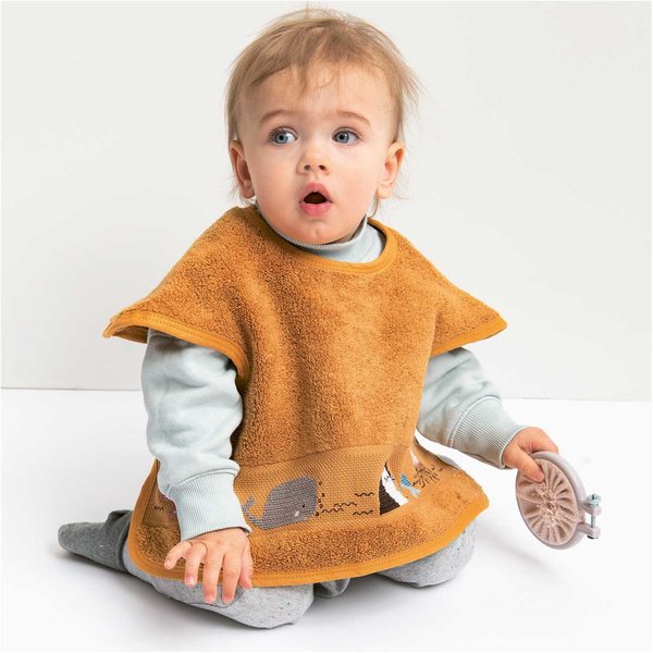 Haz que sus comidas sean más divertidas con este babero mostaza súper esponjoso con mangas. Este accesorio para los más pequeños cuenta con una cenefa de cuadrillé de la misma toalla del número 14 con 24 puntos de alto por 275 de ancho y tiene un par de cintillos en la parte del cuello para que lo amarres. Lo podrás lavar a máquina a 60° y meterlo a la secadora.