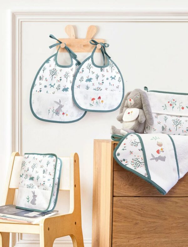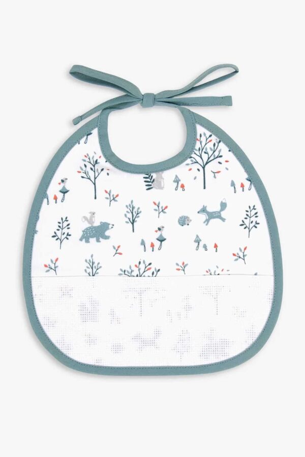 Este babero listo para bordar es un magnífico regalo para padres primerizos y futuros padres. Adecuado para bebés a partir de 3 meses. Con un estampado de bosque encantado, este babero es práctico, elegante y cómodo. Personalice este babero con un pequeño diseño para bordar en tela Aida de 5,5 pts/cm, un nombre o una fecha para un regalo único.