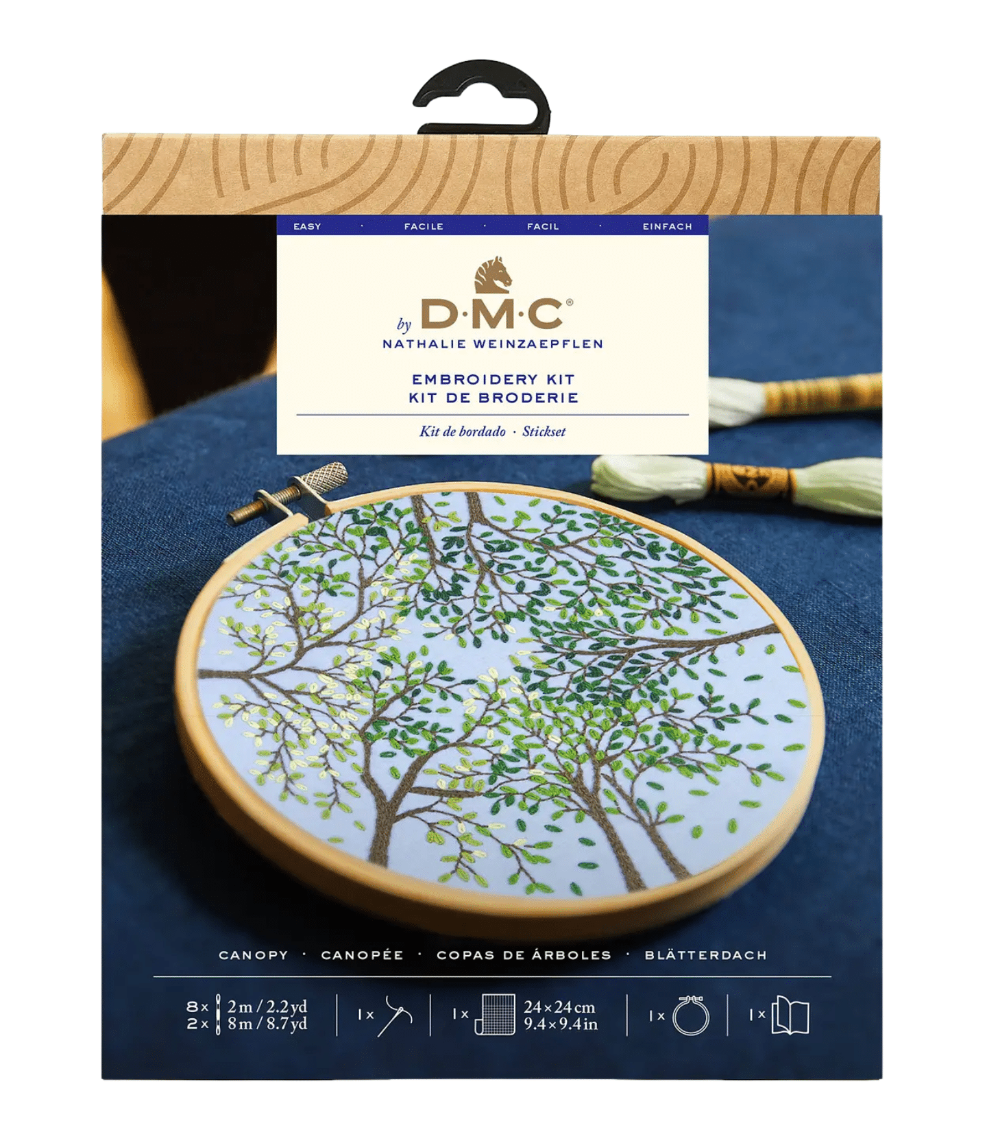 El kit contiene aida del 14 en color blanco, hilo pre seleccionado, aguja e instrucciones con un alfabeto para personalizar.