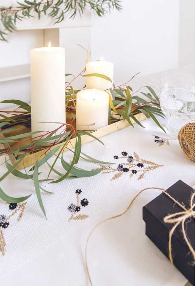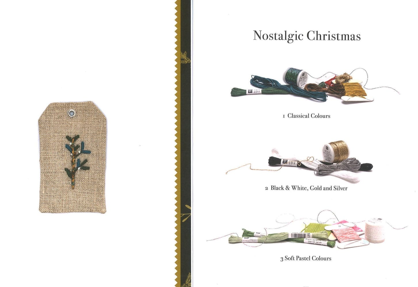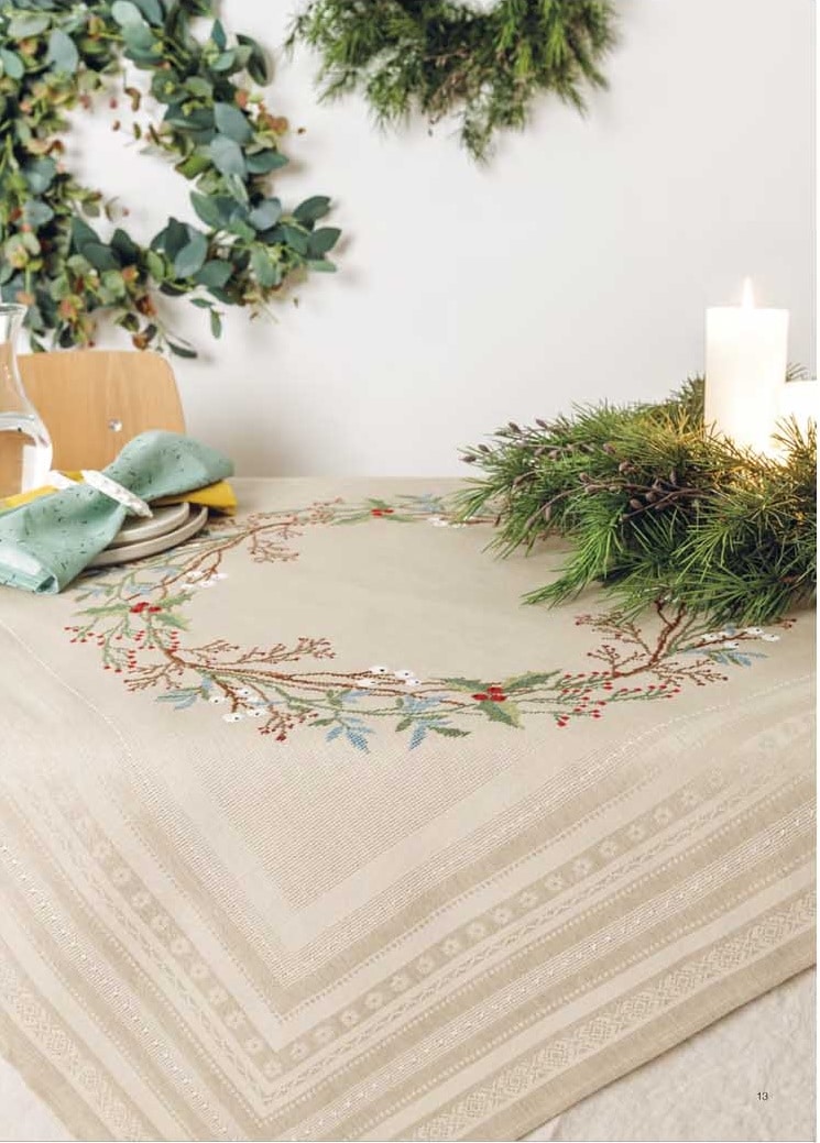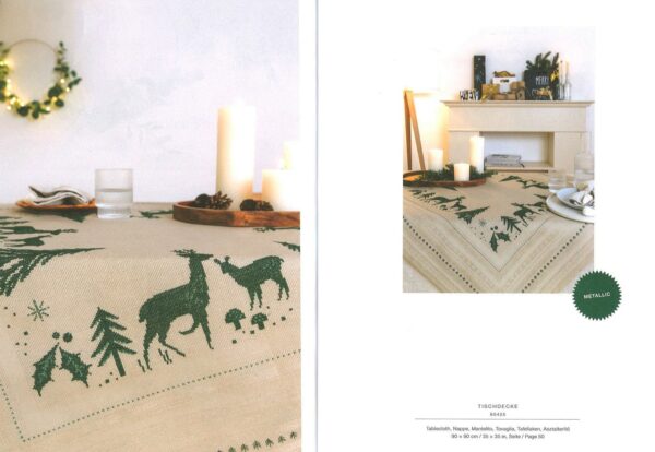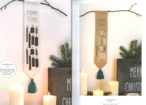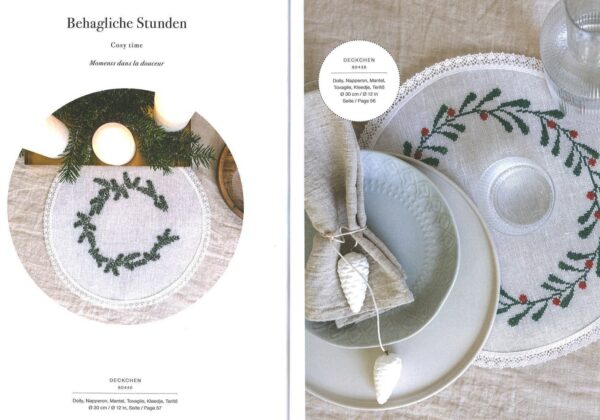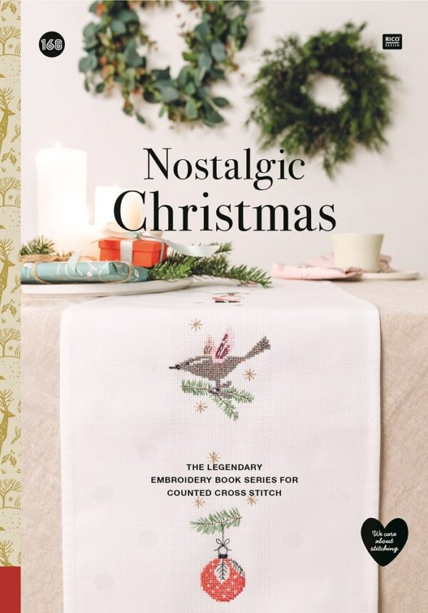 El libro No. 168 de Rico "Navidad nostálgica" está repleto de ideas inspiradoras de bordados para accesorios para el hogar. Proporciona 37 diagramas detallados para motivos de punto de cruz y bordados simples en empeine, tallo y satén. Hay patrones de conteo para siete almohadas, cinco mantas y corredores, dos tapetes con encaje, dos manteles, dos tapices, ocho cuadros, tres bordados y tres colgantes perforados. Los diseños navideños van de lo clásico a lo moderno: coronas, velas, Papá Noel, ciervos y otros animales del bosque se encuentran con motivos contemporáneos con letras y colgadores de árboles de Navidad en formas divertidas. "Navidad nostálgica" se divide en tres temas de color: clásicos que muestra tonos verdes y tierra con acentos rojos y efectos metálicos; negro-blanco-dorado con contrastes nobles y, colores nostálgicos que combinan tonos pastel con hilos de efecto metálico en colores a juego.