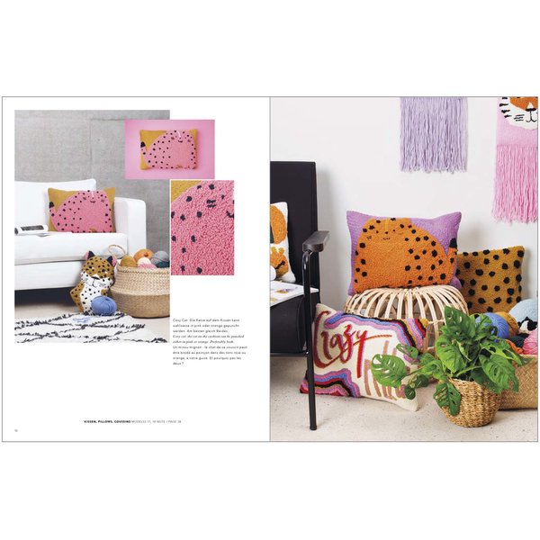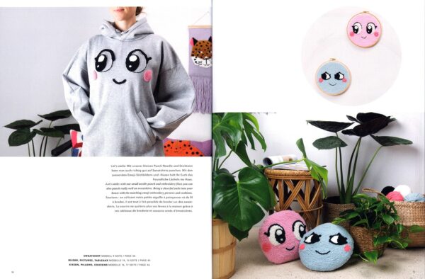 Sin duda el Puch Needle es una técnica muy contemporánea que se caracteriza por sus trazos, relieves y texturas. En este libro encontrarás 17 divertidos modelos con motivos de animales y caras graciosas. Además de una figura de leopardo y tigre, hay cojines con estos dos motivos animales, así como con gatos, diseños de animales de moda, letras coloridas y caras en colores pastel. También hay dos tapices con un tigre y un leopardo, así como lindos cuadros bordados con ojos. El libro también presenta perforaciones en una sudadera para realzarla. Toma tu aguja de Punch Needle y crea tus diseños en 3D
