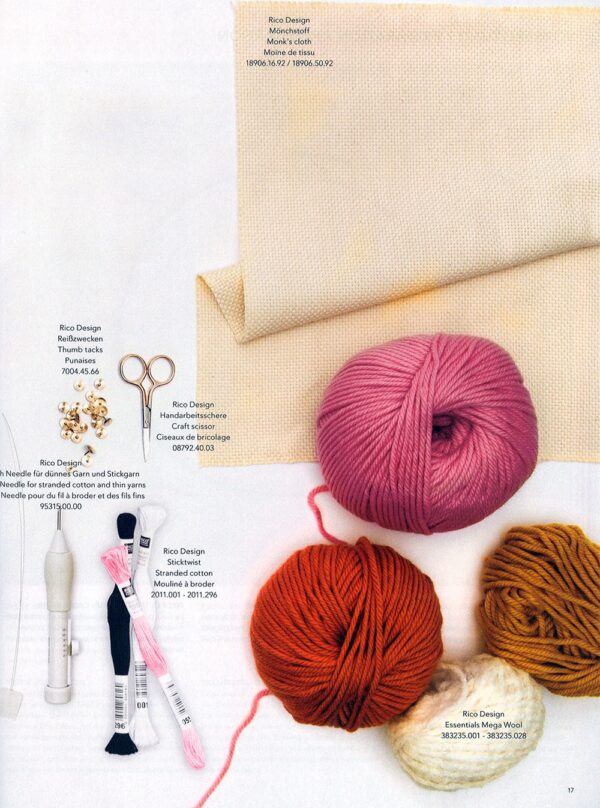 Los libros de Rico Design se caracterizan por contener diseños muy originales y exquisitos creados por diseñadores reconocidos. Sus ediciones manejan una presentación ecológica que le brinda una textura muy única al papel y en su contenido presenta diagramas muy bien definidos y de excelente tamaño. En la galería de imágenes de esta edición encontrarás la carta de conversión a los hilos de DMC.