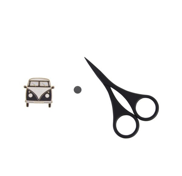 Estas tijeras con diseño único en color negro, vienen acompañadas de un imán que se coloca en la tela de trabajo para asegurar las agujas que estés ocupando en el momento por lo que te facilitará la labor de una forma segura.